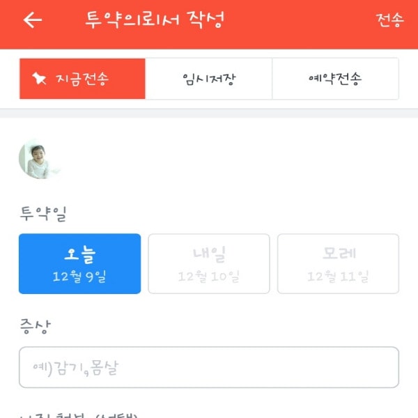 키즈노트의 투약의뢰서는 아이들이 보육기관에 있는 동안 약을 먹어야 할 때 이용하는 것입니다. 알림장과 마찬가지로 '지금 전송', '임시저장', '예약 전송'으로 구분되어 있으며 투약일, 증상, 투약 내용을 입력하고 서명한 후 전송하면 됩니다. 키즈노트의 투약의뢰서의 좋은 점은 작성할 때 가장 최근의 의뢰서 내용을 불러올 수 있는 기능이 있다는 점입니다.
